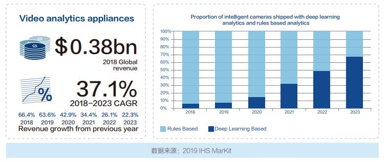 AI技術的迅猛發展促進了全球視頻分析產業的快速成長 近年來深度學習技術的迅猛發展,驅動了整體視頻分析產業的快速成長。有數據指出,2018-2023年,視頻分析產品的整體市場 規模CAGR預測達到37.1%;攝像機基於深度學習分析的智能化比例預計會從5%增長到66%。