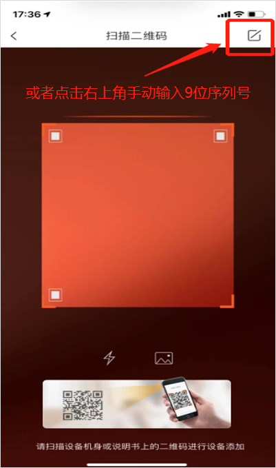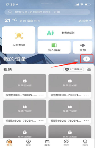 點擊右上角的+,接著掃描錄像機啟用螢石雲界麵的二維碼或者手動輸入錄像機序列號及啟用螢石雲界麵的驗證碼進行添加設備。