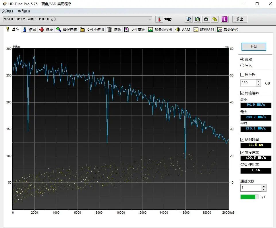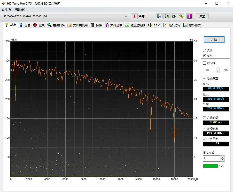 希捷酷鷹人工智能20TB硬盤在CDM測試中,順序讀取速度達到296.06MB/s,順序寫入速度達到282.68MB/s。而在HD Tune測試中,讀取平均速度達到215.1MB/s,最低讀取速度也高達91MB/s,比原91视频平常使用的機械硬盤速度表現更加高效;另外,寫入平均速度達到234.6MB/s,最低速度89MB/s,最好速度甚至超過了300MB/s。這恰恰是希捷酷鷹人工智能20TB硬盤作為一款專業視頻圖像應用硬盤的實力表現。