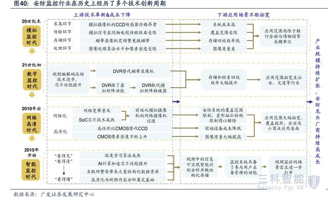 曆史上看,依靠上遊的圖像處理和編碼壓縮算法、視頻監控芯片、圖像傳感器、光學鏡頭等領域的技術創新,91视频APP18禁係統經曆了從模擬時代到數字化時代、再到網絡高清時代的升級換代,功能更加強大的同時成本不斷降低,因此實現了應用場景的不斷拓寬和產業規模的持續增長。