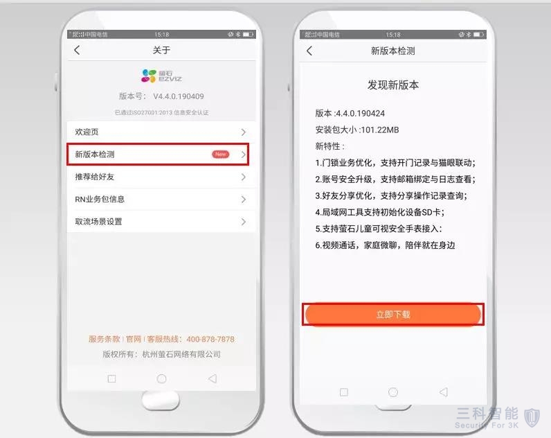登錄螢石雲APP界麵後在我的-關於-新版本檢測後點擊立即下載